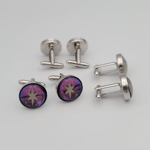 They are 18mm in diamater, with laser engraved titanium plated disks and glass domes to catch the light better and to protect the designs!