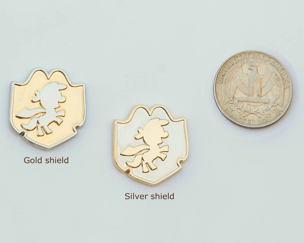 The Cutie Mark Crusaders pin, in either gold or silver (nickel) plated shield. Join the quest for your special talent with one of these shiny pins.