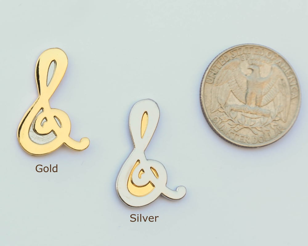Treble clef shaped pin that matches Octavia's (or Fiddlesticks) cutie mark, This 3d relief pin is gold/nickel dual plated and very very shiny.