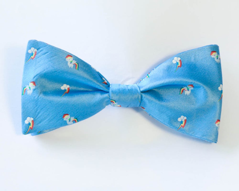 This is a self-tie bow tie. Which doesn't mean that it ties itself, but instead that you tie it yourself. It has the same color and pattern that Raintie Dash has, but on silk satin instead of silk twill. The result is a smoother and slightly more glossy surface, which lends itself well to the bow tie form.