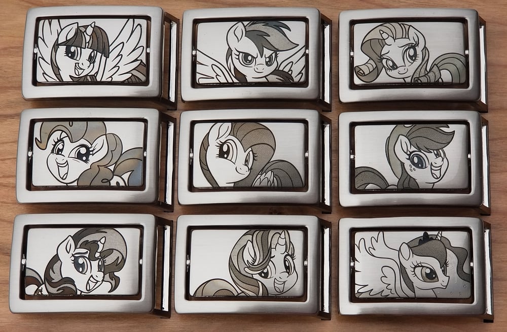 Reversible metal belt buckles! You can wear it pony side, or be a bit more stealthy and swap it to the cutie-mark side instead! They're nice, solid metal, and the top part can rotate when you put the belt on, but will stay nice and solid once it's on.